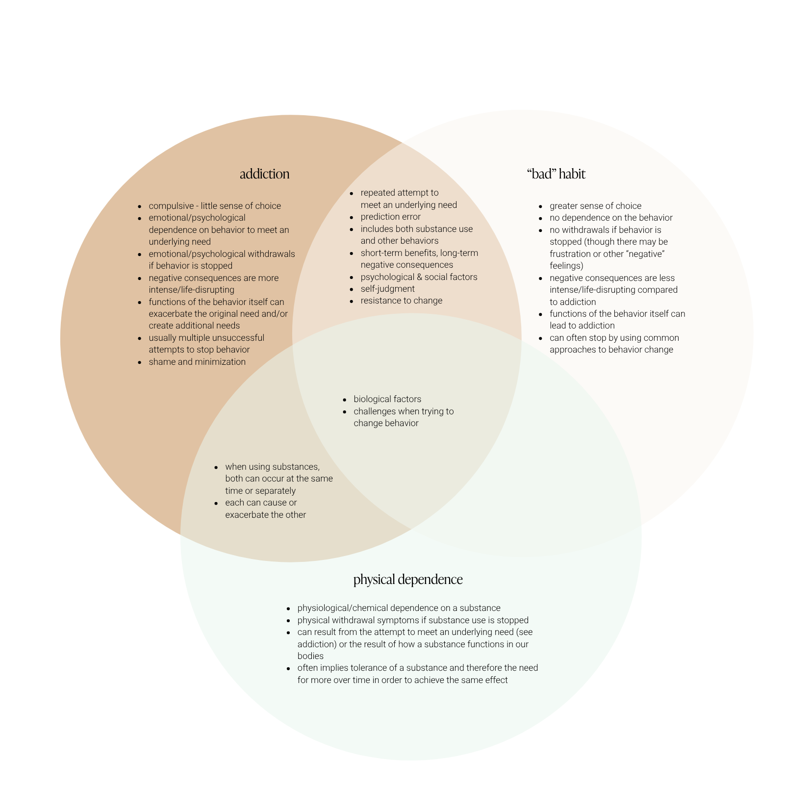 As we try to understand what is going on for us, it can be helpful to zoom out and to see how addictions, habits, and physical dependence intersect. While there is no obvious line we cross from one to the other, this kind of visual can help us to recognize where our behavior lies on the spectrum from habit to addiction, as well as where it might dip into physical dependence. From there, we can start to get clarity about how to move forward.